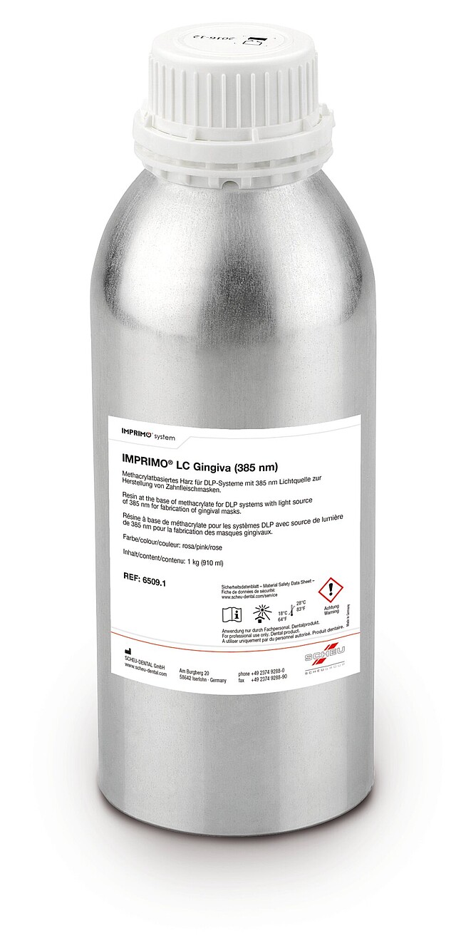 Lichthärtendes, flexibles Harz zur Herstellung von Zahnfleischmasken, rosa. Abgestimmt auf DLP-Systeme mit einer Lichtquelle von 385 nm.