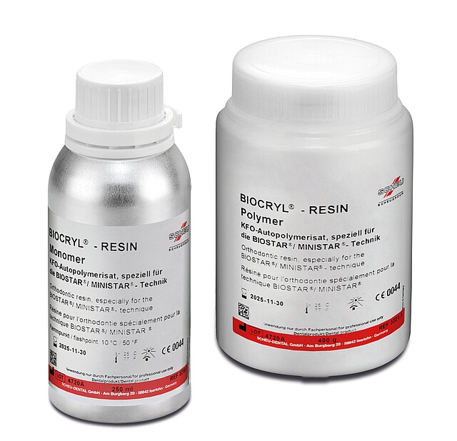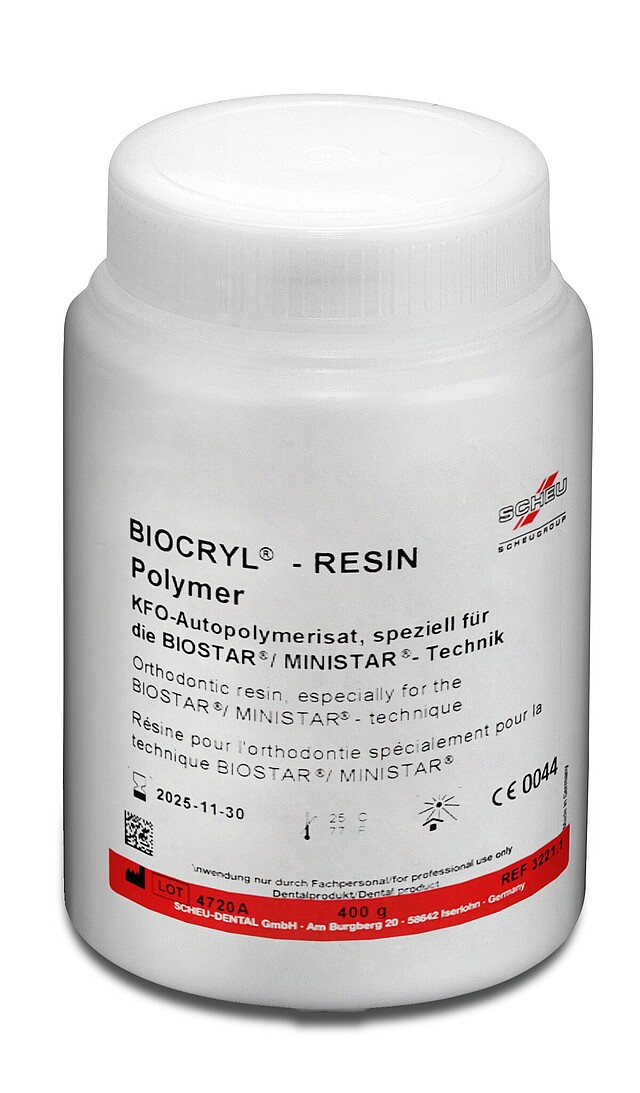 Spezielles KFO-Autopolymerisat zum Einpolymerisieren und Unterfüttern von Klammerenden und Dehnschrauben bei der Herstellung von Retentions- und Dehnplatten aus BIOCRYL® C in der Druckformtechnik. Die Polymerisation erfolgt während der Abkühlphase im Druckformgerät. Die zeitaufwendige, konventionelle Methode der Drucktopf-Polymerisation entfällt.