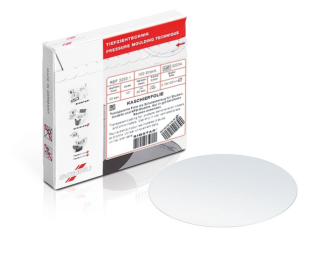 Spannen Sie die Folie bei den SCHEU-DENTAL Tiefziehgeräten so ein, dass die Bedruckung der eingespannten Folie von oben lesbar ist. Bei anderen Geräten überprüfen Sie bitte das jeweilige Heizsystem, denn ggf. wird die Folie nach dem Beheizen nicht mehr geschwenkt. Bei nicht bedruckten/codierten Folien spielt es keine Rolle, wie Sie die Folie einspannen.